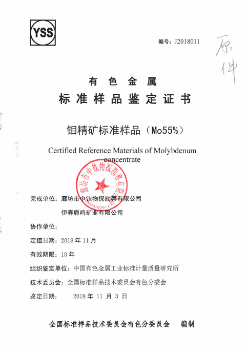 承擔并完成中鐵資源集團科研課題5項,分別為《鉬精礦國家標準樣品研制》、《鹿鳴鉬精礦中鉬及雜質元素XRF測定研究》、《剛果(金)銅鈷礦銅鈷物相分析》、《地球化學樣品中Nb、Ta、Zr、Hf及稀土元素的準確測定》、《鉛精礦中銀的快速分析測定》等,其中《鉬精礦國家標準樣品研制》項目,2018年11月于全國標準樣品技術委員會有色金屬標準樣品鑒定會上評審通過,研制水平評定為國際先進水平。